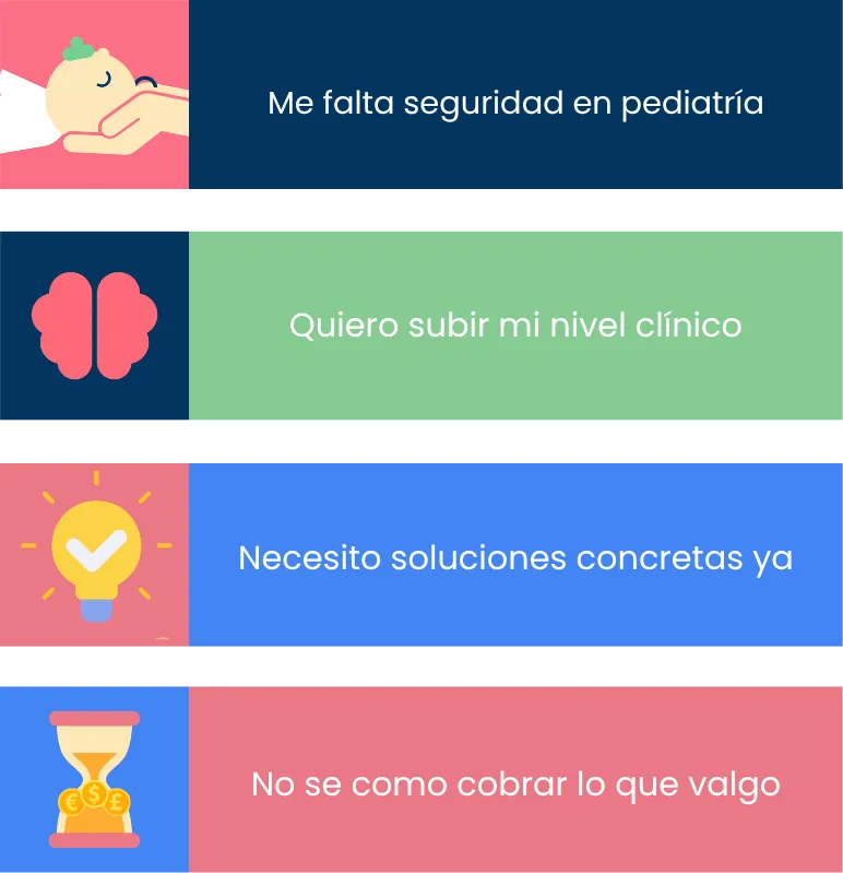 Me parece un curso muy completo. La plataforma con los vídeos está muy bien organizada y facilita mucho el aprendizaje. Personalmente, me ha abierto un mundo que desconocía: la complejidad de la pediatría. - Eva Mila